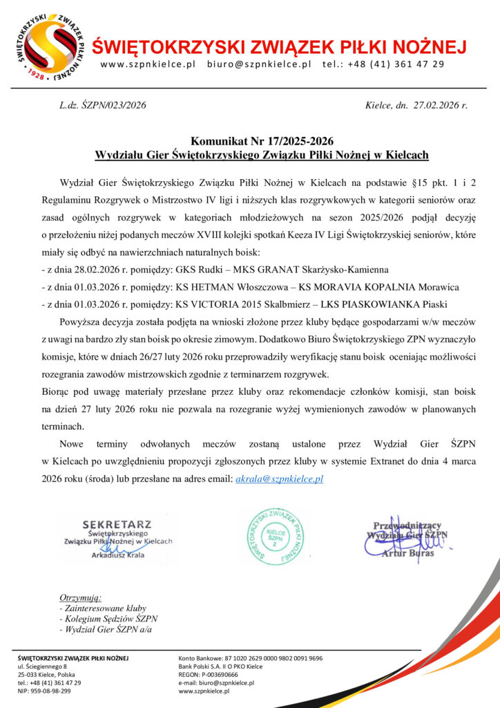 Wydział Gier Świętokrzyskiego Związku Piłki Nożnej podjął decyzję o przełożeniu trzech meczów XVIII kolejki Keeza IV Ligi Świętokrzyskiej seniorów z uwagi na zły stan boisk po okresie zimowym.