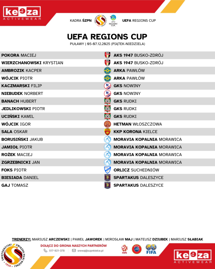 Tak prezentuje się ostateczna lista zawodników, którzy w dniach 5–7 grudnia 2025 roku będą reprezentować województwo świętokrzyskie podczas Turnieju Makroregionalnego UEFA Regions Cup w Puławach. Stawką jest awans do finałów ogólnopolskich