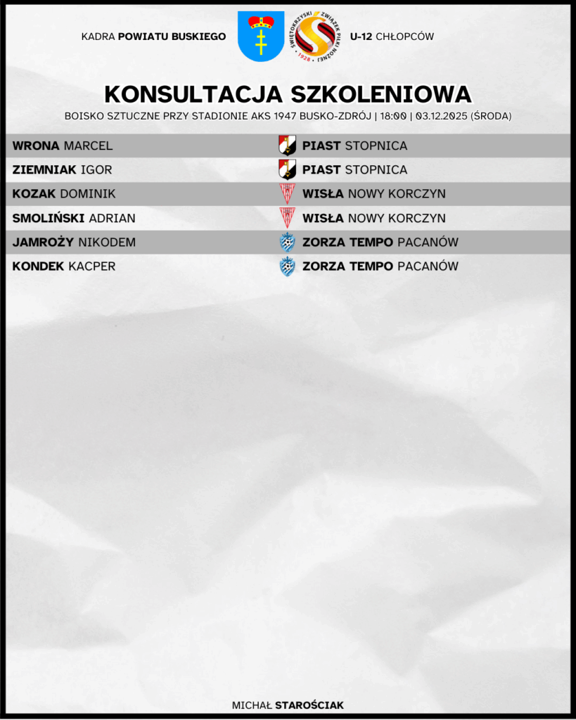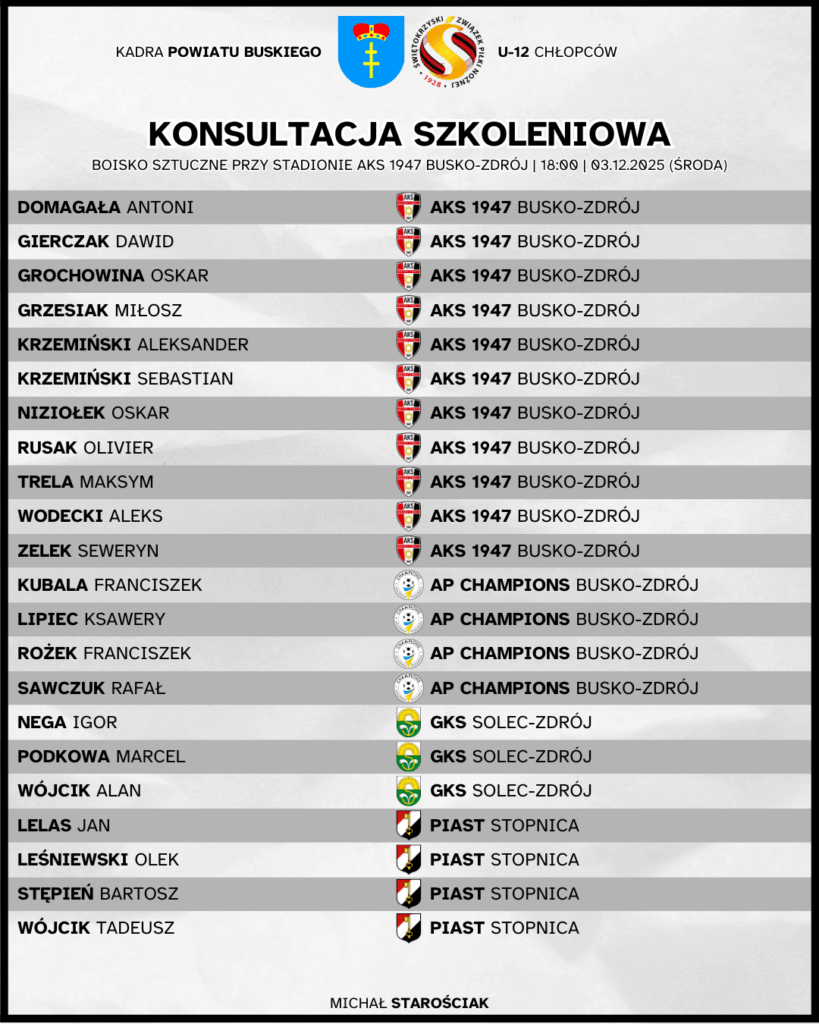 Wydział Szkolenia Świętokrzyskiego ZPN informuje, że 3 grudnia 2025 na obiekcie Stadion Miejski Busko-Zdrój (boisko sztuczne) odbędzie się konsultacja szkoleniowa kadry powiatu buskiego rocznika 2014.
