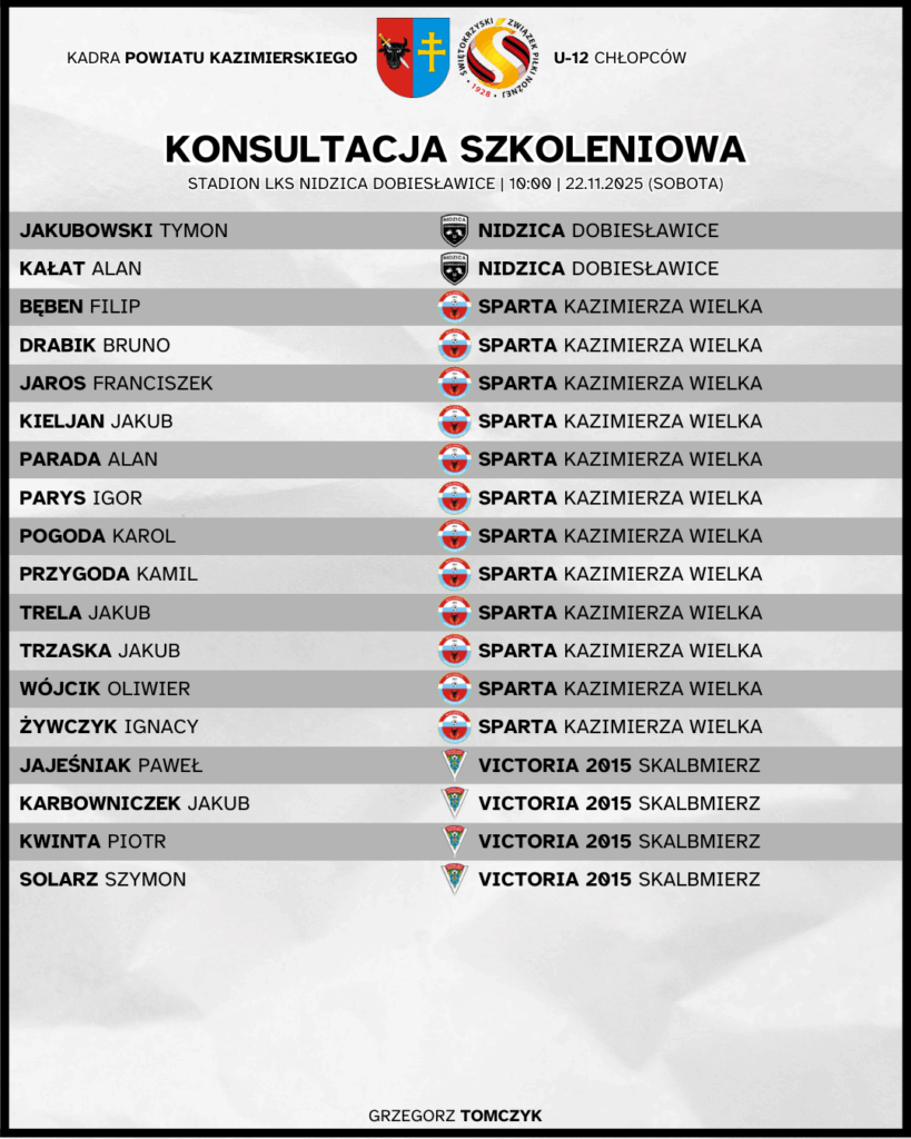 Trener koordynator powiatu kazimierskiego ogłosił listę zawodników powołanych na konsultację szkoleniową, która odbędzie się w sobotę, 22 listopada 2025 roku, w godzinach 10:00-12:15.