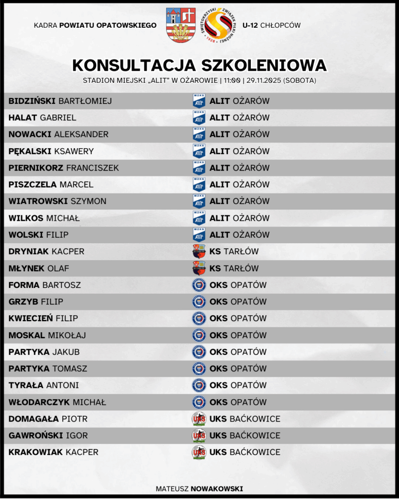 Wydział Szkolenia Świętokrzyskiego Związku Piłki Nożnej informuje, że w dniu 29 listopada 2025 roku na obiekcie Stadion Miejski „Alit” w Ożarowie o godzinie 11:00 odbędzie się konsultacja selekcyjno-szkoleniowa kadry powiatu opatowskiego rocznika 2014.