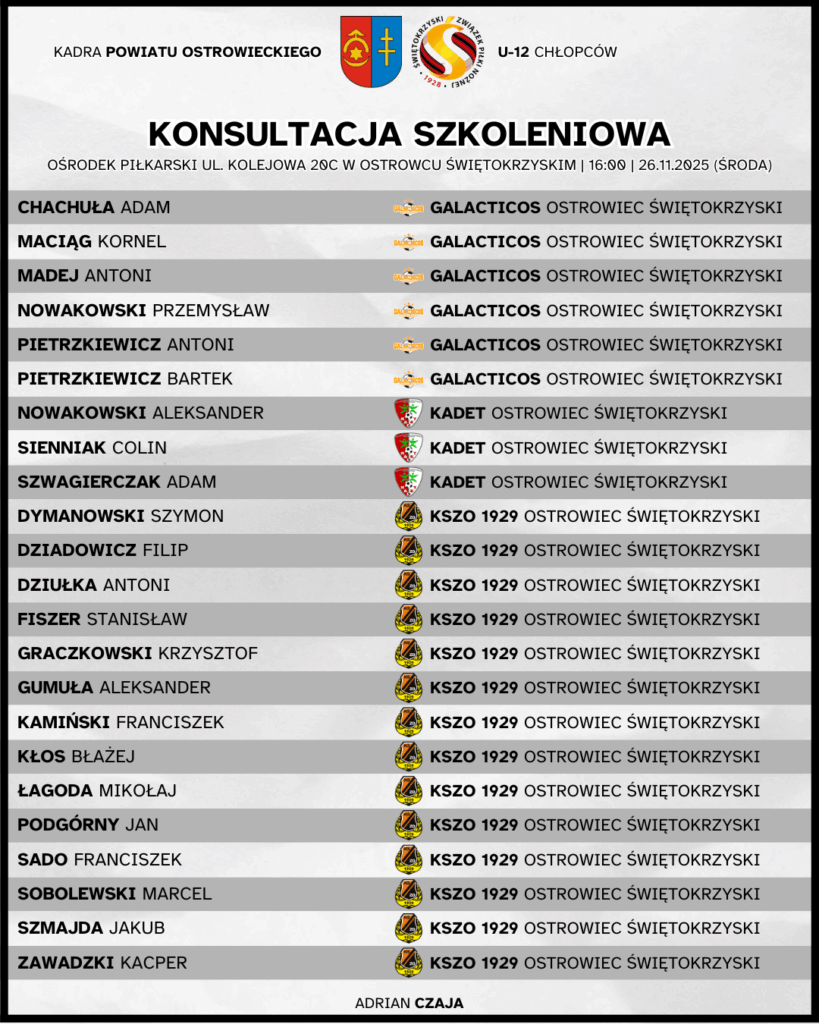 Wydział Szkolenia Świętokrzyskiego Związku Piłki Nożnej informuje, że 26 listopada 2025 roku na obiekcie Ośrodek Piłkarski, ul. Kolejowa 20C w Ostrowcu Świętokrzyskim o godzinie 16:00 odbędzie się konsultacja szkoleniowa kadry powiatu ostrowieckiego rocznika 2014.