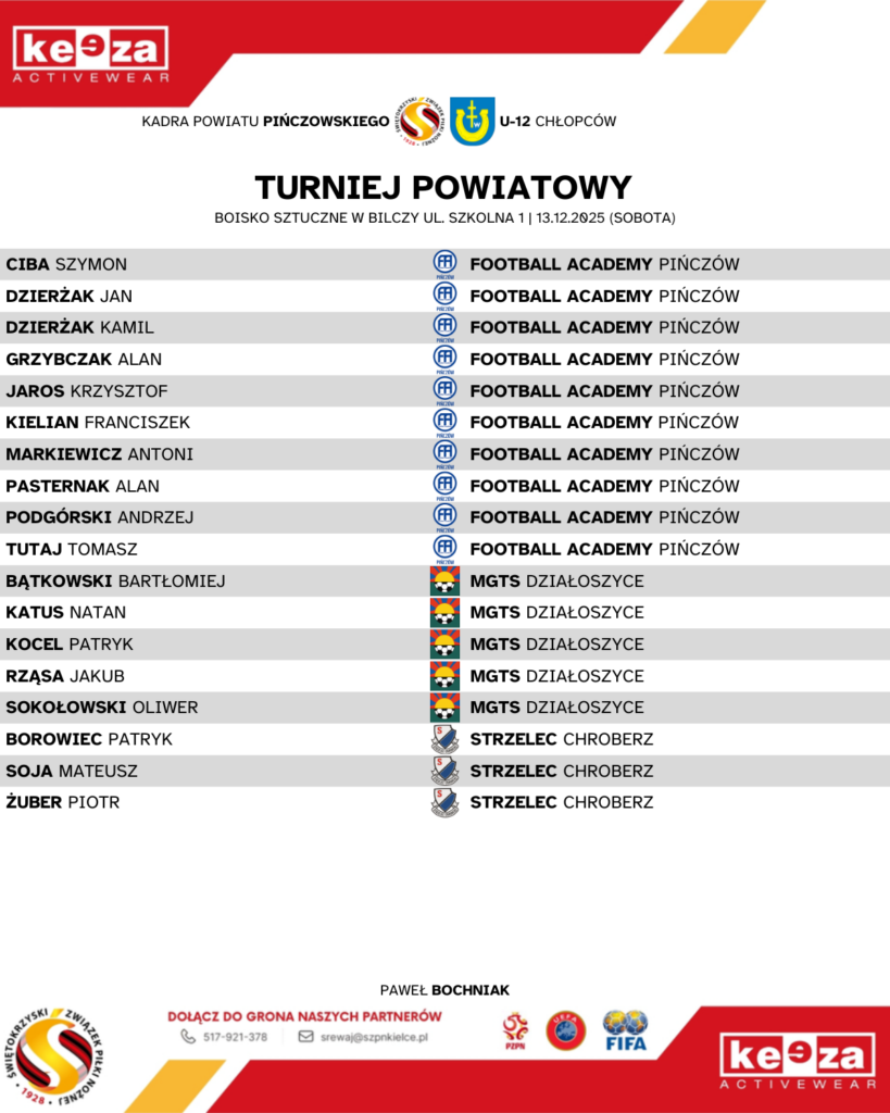 Wydział Szkolenia Świętokrzyskiego Związku Piłki Nożnej informuje, że 13 grudnia 2025 r. na obiekcie przy ul. Szkolnej 1 w Bilczy odbędzie się turniej kadr powiatowych rocznika 2014.