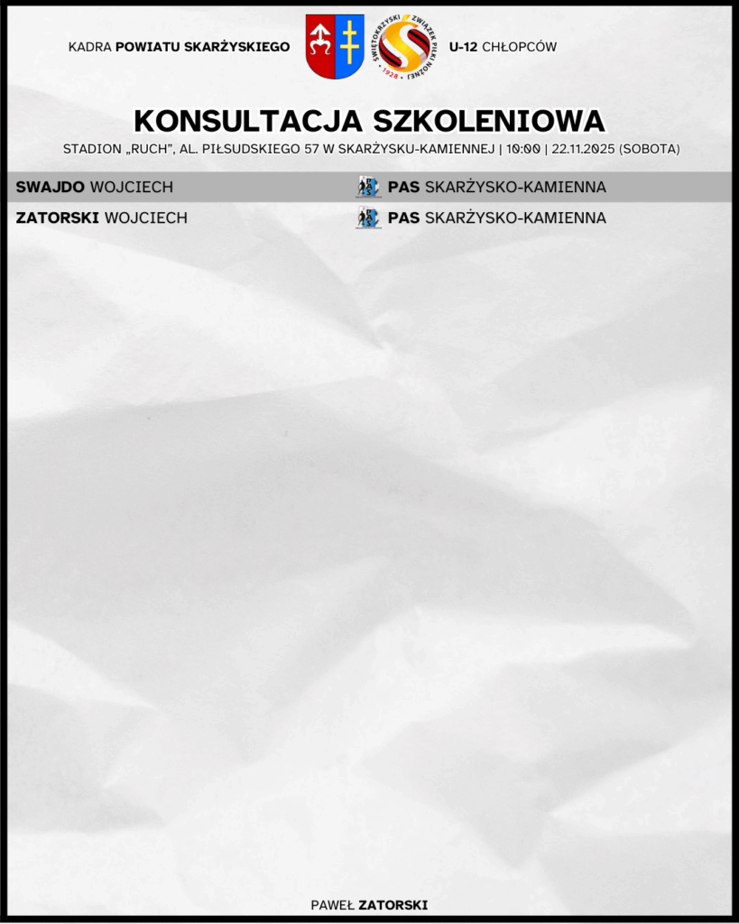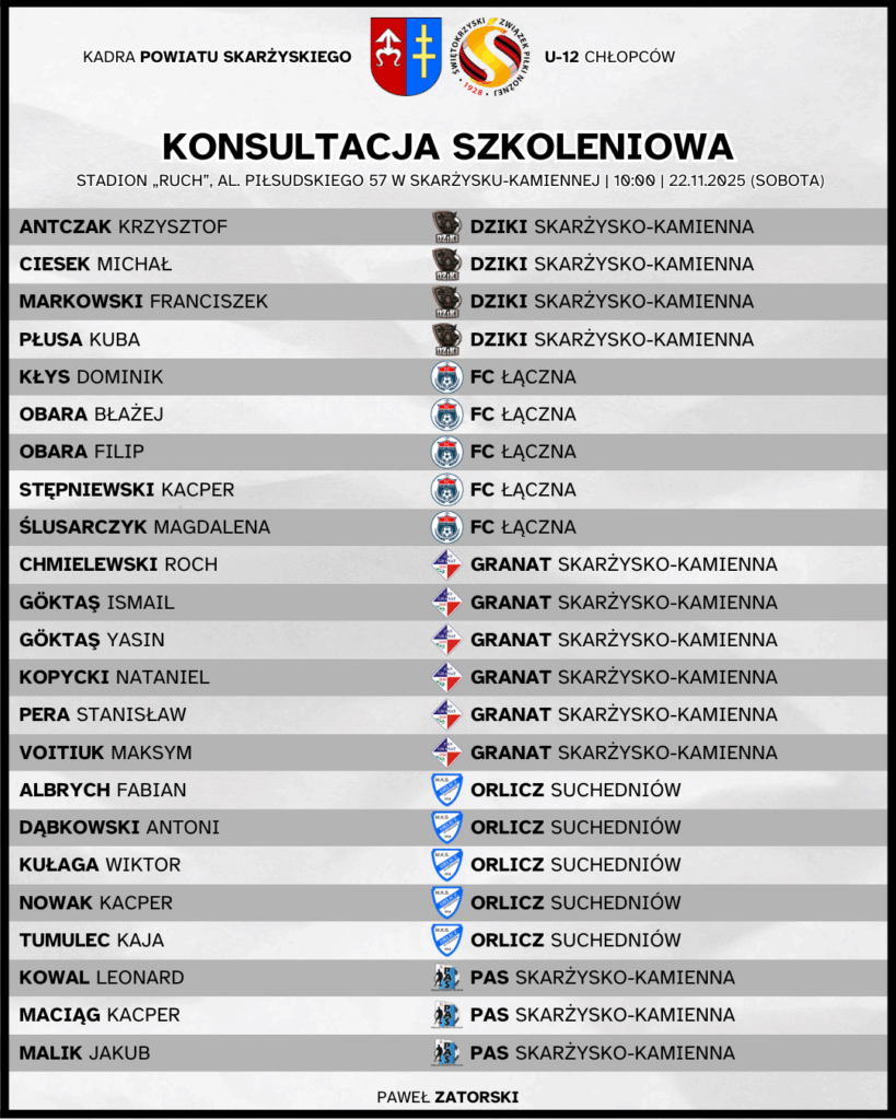 Wydział Szkolenia Świętokrzyskiego Związku Piłki Nożnej informuje, że w dniu 22 listopada 2025 r. (sobota) odbędzie się konsultacja selekcyjno-szkoleniowa kadry powiatu skarżyskiego rocznika 2014.