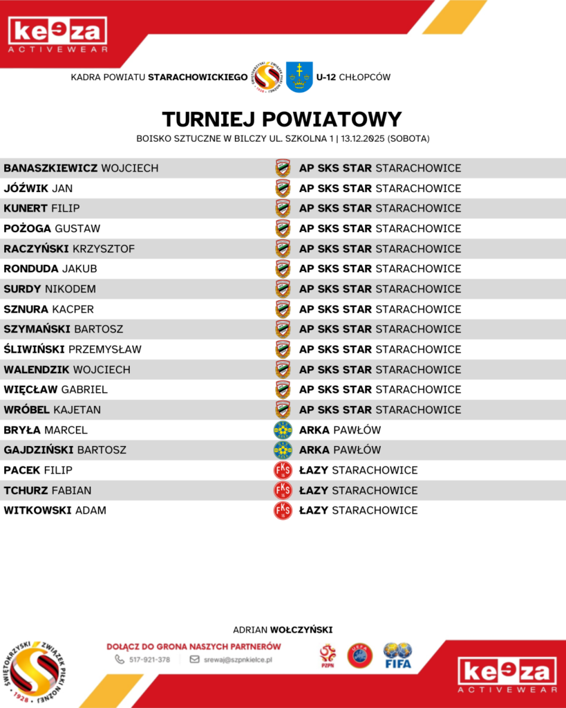 Wydział Szkolenia Świętokrzyskiego Związku Piłki Nożnej informuje, że 13 grudnia 2025 r. na sztucznym boisku przy ul. Szkolnej 1 w Bilczy odbędzie się turniej kadr powiatowych