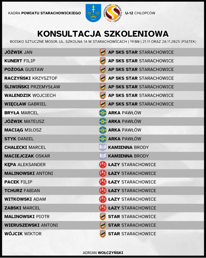 Wydział Szkolenia Świętokrzyskiego Związku Piłki Nożnej informuje, że w dniach 21 i 28 listopada 2025 roku na sztucznym boisku MOSiR, ul. Szkolna 14 w Starachowicach, o godzinie 19:00 odbędzie się konsultacja selekcyjno-szkoleniowa kadry powiatu starachowickiego rocznika 2014.