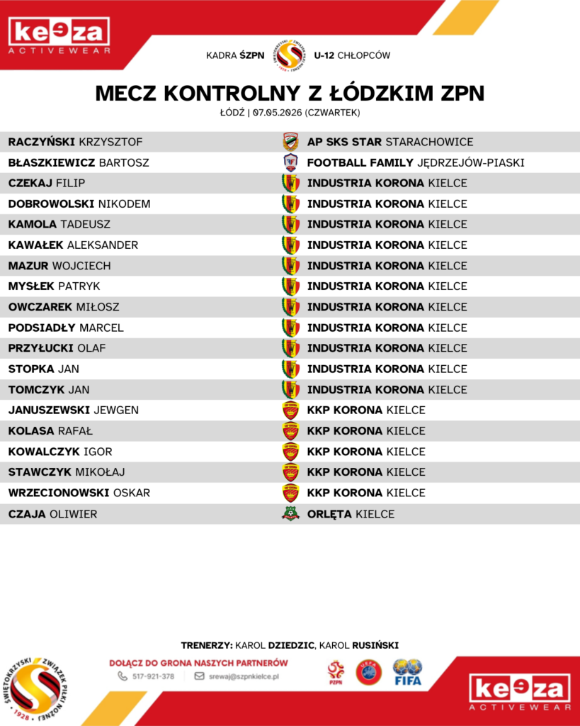 Wydział Szkolenia Świętokrzyskiego Związku Piłki Nożnej informuje, że w dniu 07.05.2026 r. kadra ŚZPN U-12 rozegra mecz kontrolny z Łódzkim ZPN w Łodzi.