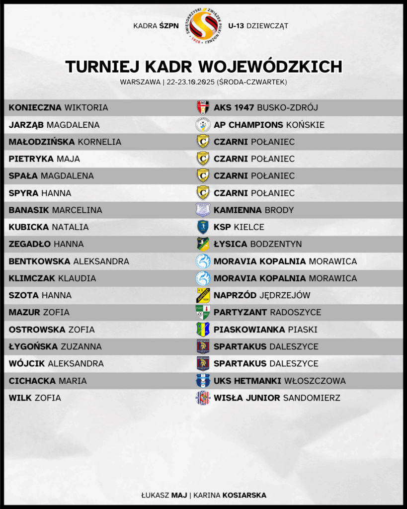 Wydział Szkolenia Świętokrzyskiego Związku Piłki Nożnej informuje, że w dniach 22–23 października 2025 r. w Warszawie odbędzie się Turniej Kadr Wojewódzkich Dziewcząt U-13.