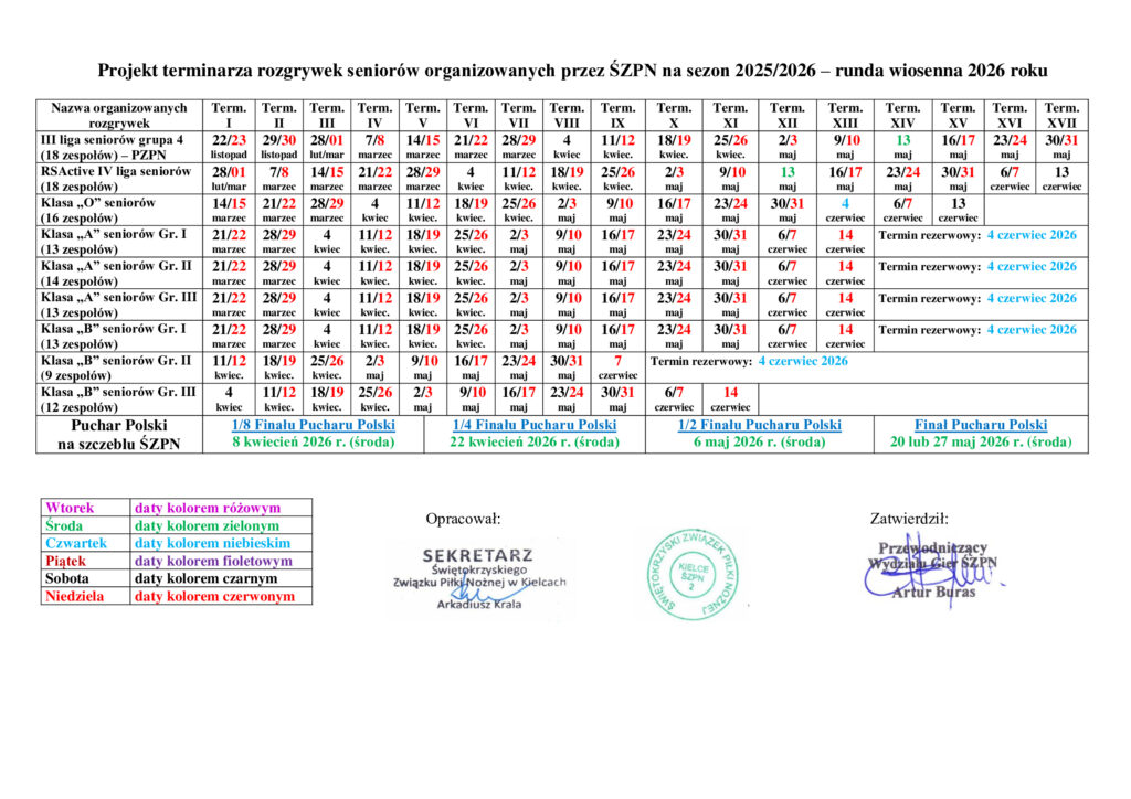 Projekt terminarza rozgrywek seniorskich na rundę wiosenną sezonu 2025/2026